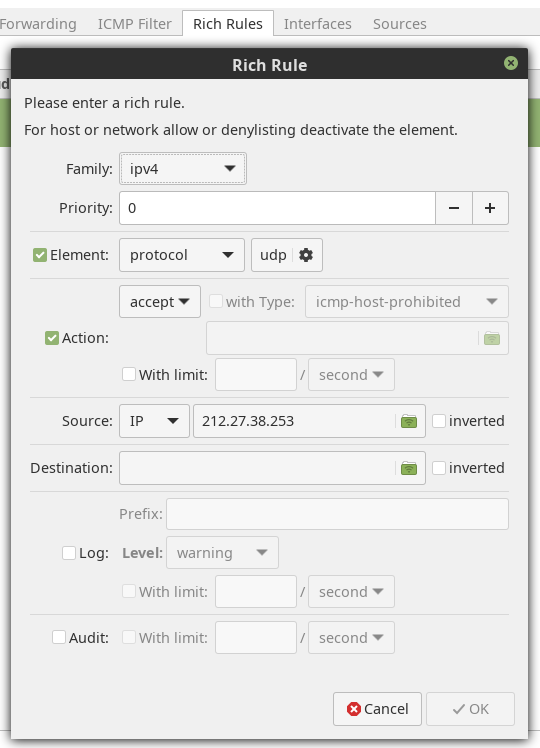 firewalld.rich.rules.png Share via Share via... Twitter LinkedIn Facebook Pinterest Telegram WhatsApp Yammer Reddit TeamsRecent ChangesSend via e-MailPrintPermalink × Size of this preview: 433 × 600 pixels. Other resolutions: 54 × 74 pixels 135 × 187 pixels 270 × 374 pixels 405 × 561 pixels 540 × 748 pixels home:firewalld.rich.rules.png ( 540 × 748 pixels ) Information Date:2021/01/30 07:46Filename:firewalld.rich.rules.pngFormat:PNGSize:46KBWidth:540Height:748 References for vlc This list might not be complete due to ACL restrictions and hidden pages. Metadata Exif IPTC home/vlc.txt Last modified: 2021/01/30 07:49by lamboringo